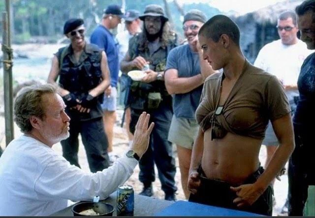 5) Ридли Скотт и Дэми Мур на закулисном фото со съёмок фильма "Солдат Джейн" (1997). В действительности прошло ещё 19 лет, и только после этого женщин стали принимать в спецподразделения ВМФ США. Подготовка женщин к службе в спецназе ВМФ США началась только в марте 2016 года. 99,99% кандидаток оказываются не в силах пройти курс подготовки.