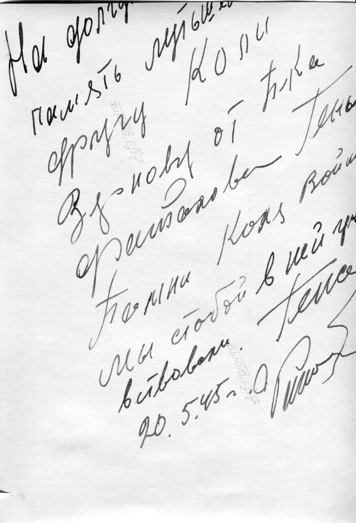 Еще я обратил внимание, что многие фотографии не были подписаны. Поэтому сходу не удалось определить имя изначального хозяина фотоальбома. Но я нашел одну фотографию, на которой была надпись "На долгую память лучшему другу Коли Зернову от п-ка Ф.... Гены. Помни Коля войну. Мы с тобой в ней участвовали. Гена 20.5.1945г.