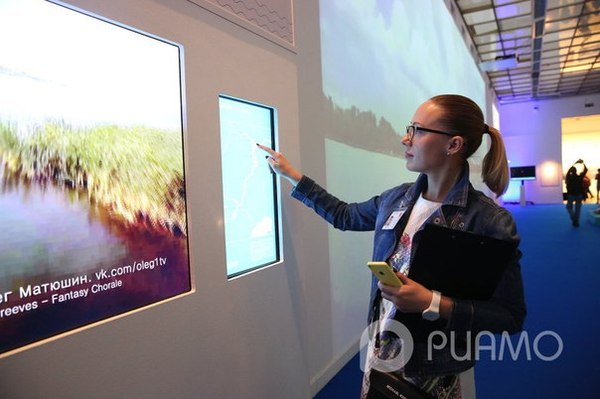 Благодаря 38-метровой аудиовизуальной инсталляции посетители выставки смогут почувствовать себя на борту парохода, плывущего по главной водной артерии страны - Волге.