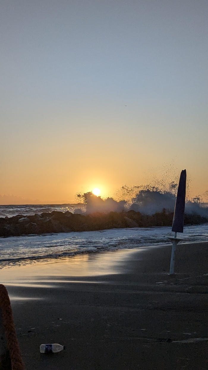 Я планировал дойти до конца пирса, где находился маяк. (вчера его приметил) Очень люблю волны и их звук, поэтому направился туда, и наделся на солнце, чтобы смог хоть немного подремать. Но не повезло, я дошел до пирса, решил подождать там солнце, сев на мокрую скамейку. Мне, откровенно говоря, в тот момент было лень возвращаться под навес.