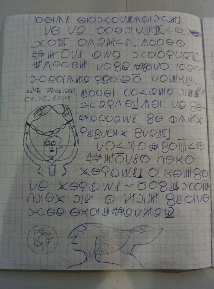 А вот теперь минутка реальной крипоты. Эта девушка на рисунке - я. То есть автор тетради либо знает меня, либо видел, как я забирала саму тетрадь. Оба варианта вероятны, потому что В1 - это мой уровень по немецкому, а куртка на рисунке - та самая, в которой я забирала тетрадь.