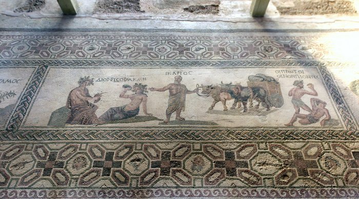 От самих зданий немногое осталось, но зато от них остались полы, выложенные мозаикой. Сама по себе идея выложить пол мозаикой многое говорит об уровне роскоши. Вот представьте себе, что вы строите дом и такие думаете: "Выложить пол ламинатом, постелить линолеум или мозаику положить? Конечно, мозаику!"