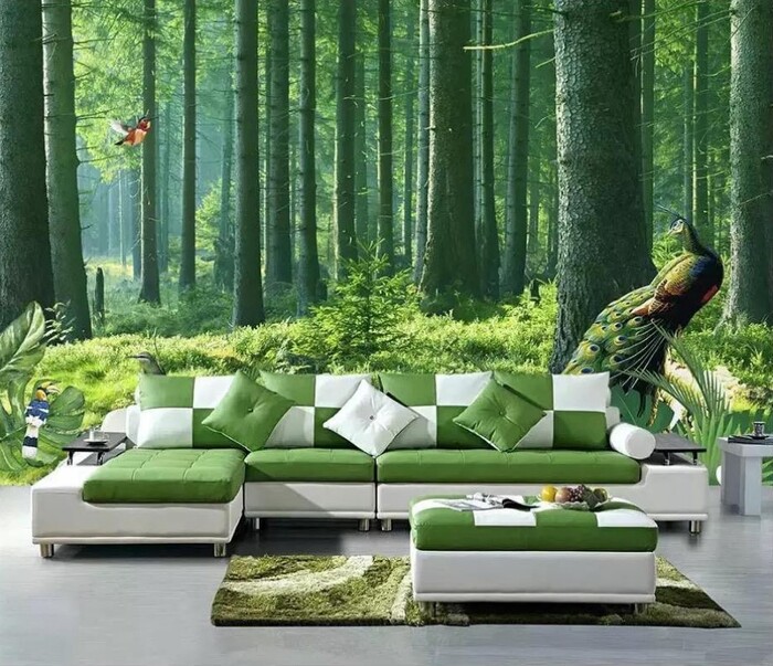 К 2022 году усовершенствованные фотообои подходят на пике востребованности. В тренде изображения, вносящие в помещение перспективу. Это может быть дорожка, уходящая вдаль, окно с невероятно красивыми видами за ним. Наполняет гостиную ощущением роскоши изображение камина с величественной отделкой или книжных полок с редкими изданиями в богатых переплетах.