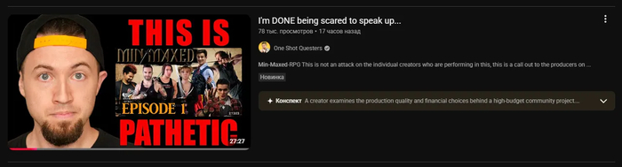 - Он тоже отмечает ужасный звук. В комментариях рассказывают, что сильное эхо в эпизоде получилось потому, что звук писался на петличные микрофоны... *facepalm.jpg* Есть подозрение, что, будучи преимущественно шортс-креаторами, участники MinMaxed решили писать звук привычным им способом, не зная о недостатках использования петличных микрофонов для съёмок статичных сцен. Либо они наняли некомпетентного звукача, который взял деньги и прокатил их с этим решением.