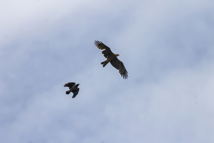 На отходе заметил как серая ворона гоняла чёрного коршуна. Судя по его потрёпанному виду жизнь у него тяжёлая.