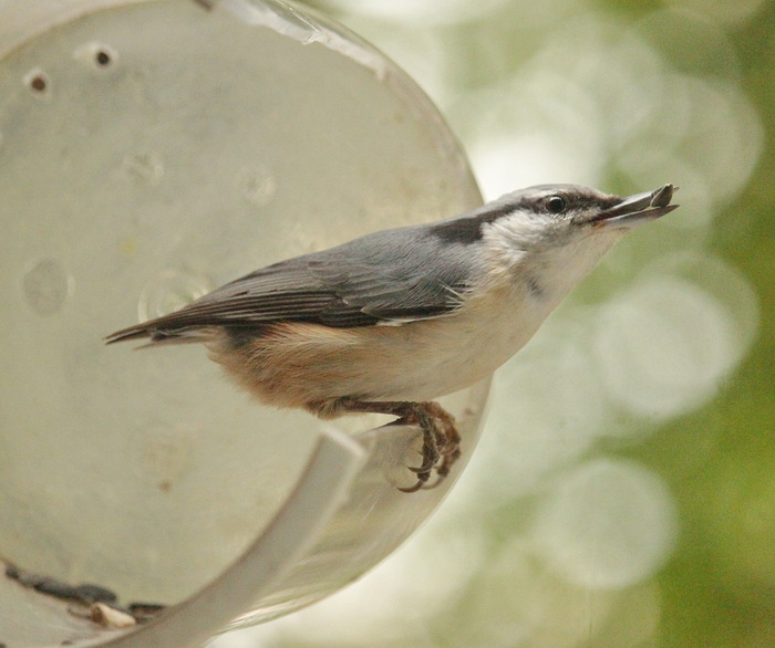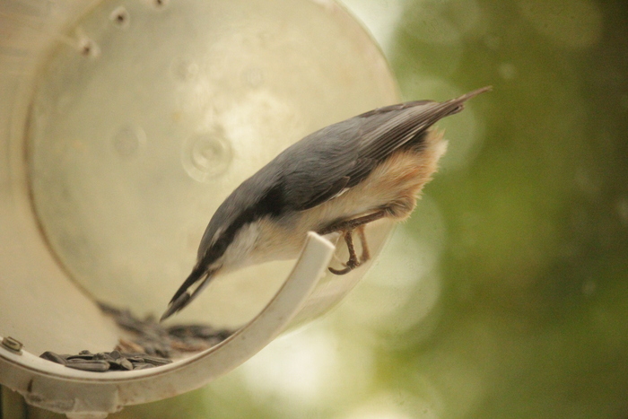 Синиц он несколько раз прогонял, но они похоже и сами его побаиваются, но вот от воробьев (которые не часто прилетают), он сам сваливает.)