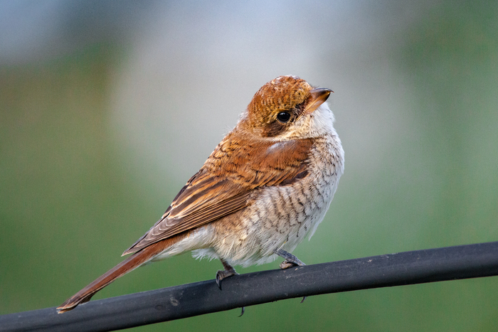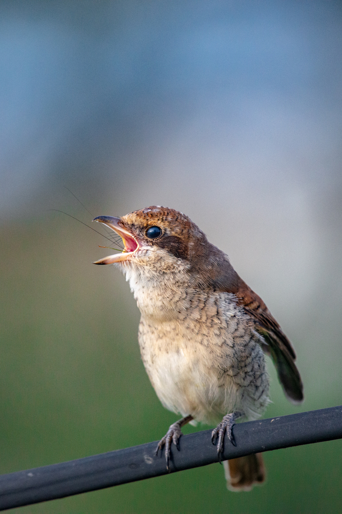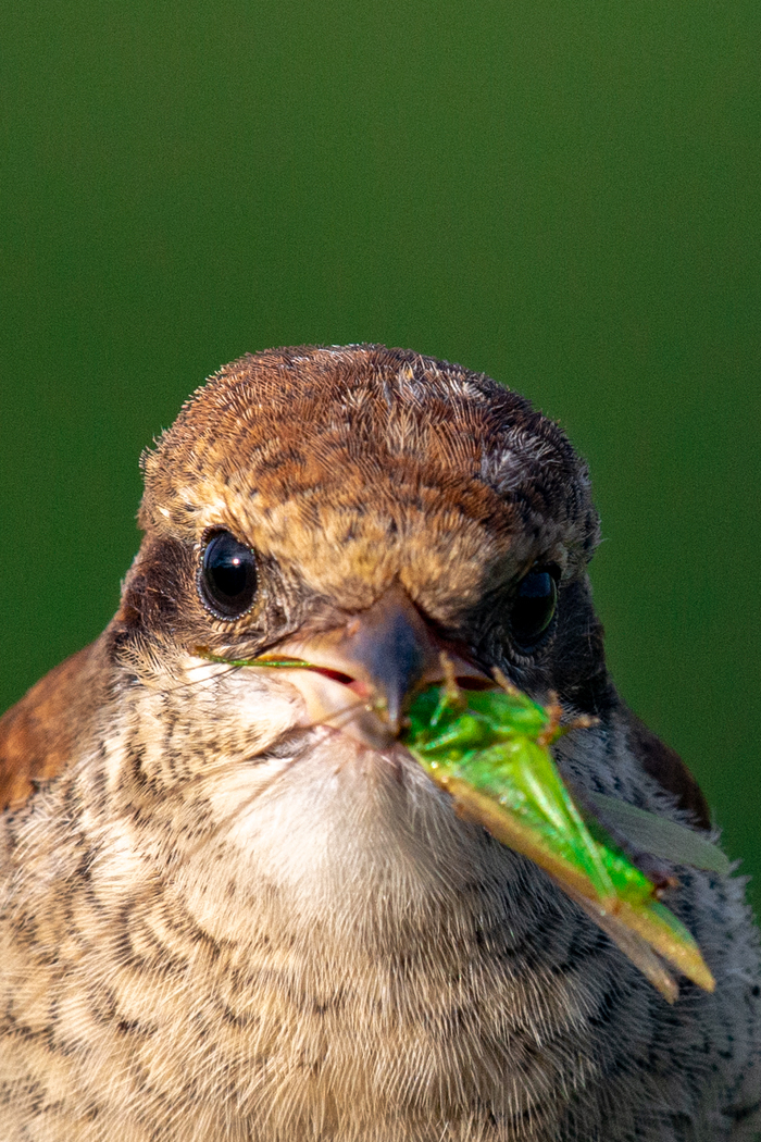 Сорокопут жулан, слеток, уже самостоятельный и живущий отдельно от родителей: сидел на краю полянки, на которой охотил кузнечиков - а я охотила его на фотоаппарат.