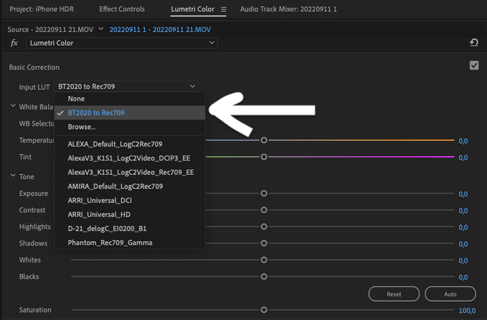 3. Корректирующий слой на таймлинии - Lumetri Color - Basic Correction - Input LUT - BT2020 to Rec.709