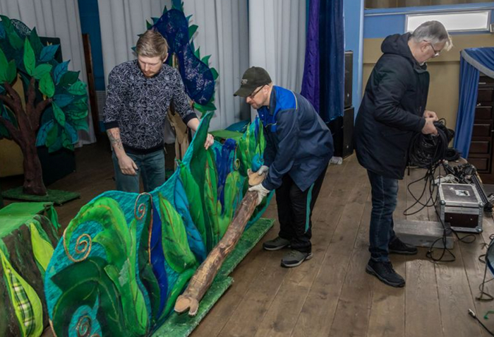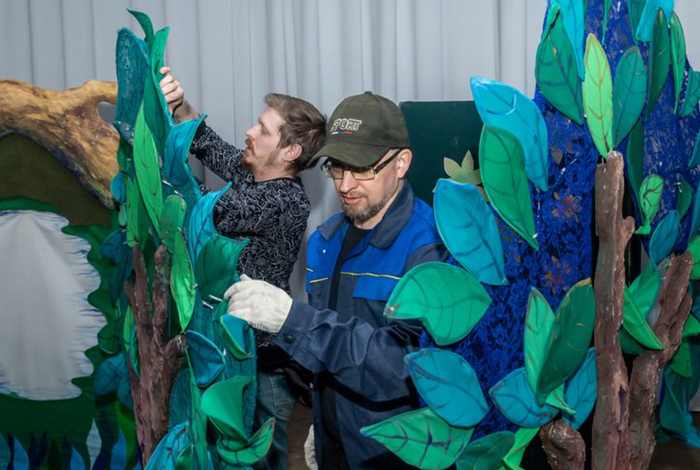 На сцене вырастает сказочный лес. Монтировщики Владимир Кузнецов и Денис Куковицин справляются со своей задачей меньше чем за полчаса. Всё стоит на своих местах, как это задумано постановщиками