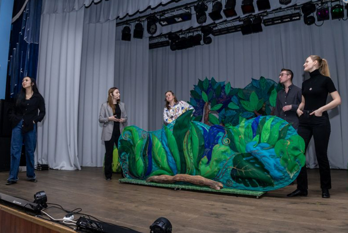 Пока машинисты сцены устраивают сказочный пруд и заросли вокруг него, звукорежиссёр Александр Елисеев настраивает свою аппаратуру и выдаёт микрофоны артистам — их должно быть слышно на самых последних рядах. Оборудование в кинозале ДК «Кольцово», созданном в 2021 году на средства нацпроекта «Культура», новое, но у театральной постановки свои особенности. НОТЕК на этой площадке — частый гость. «Гастрольная жизнь театра диктует свои условия — нужно быть во всеоружии. Поездка в Кольцово — это ещё не гастроли, ими считаются выезды более 100 километров. В этом году театру кукол предстоит дать 21 спектакль в гастрольных поездках по области, и это очень разные площадки», — рассказывает администратор Татьяна Зиневич.