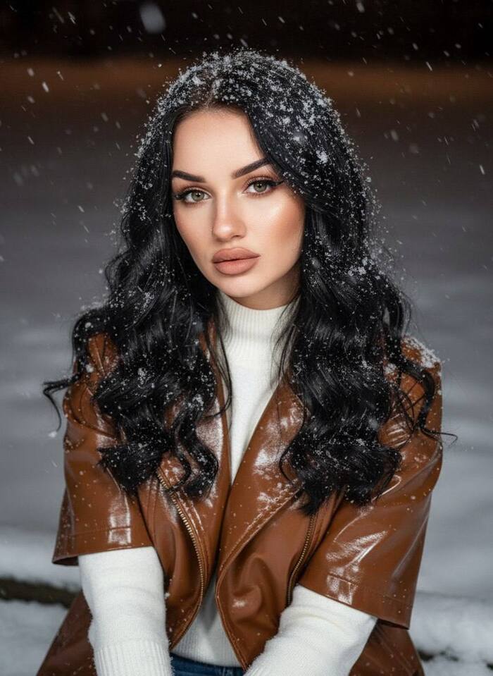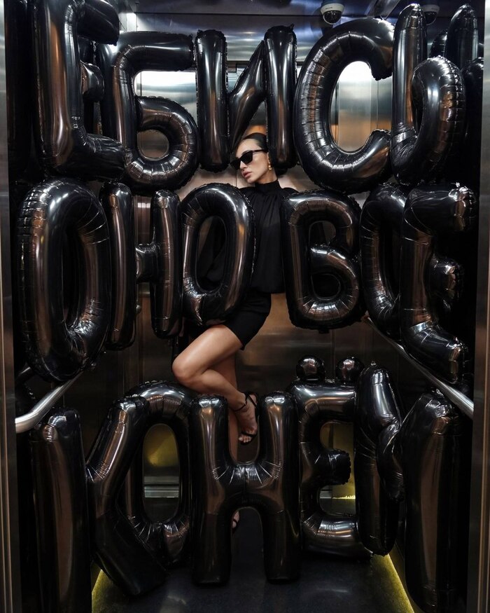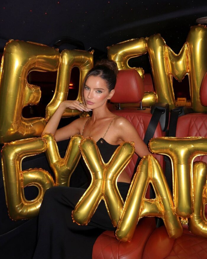 Референс: загруженное фото. Сохранить лицо, тело, пропорции, цвет и длину волос. Создай ультра реалистичное фото празднования дня рождения, вертикальный портрет 4:5, женщина отмечает свой 29-ый день рождения, стоя в современном квартире. Одежда: кремовые шелковые пижамные штаны. Приталенный вязаный кардиган молочный, с вырезом на груди и пуговицами в тон. Талия подчеркнута, кардиган до бедер, широкие рукава, объемные плечи. На шее тонкая цепочка серебряная с квадратным камнем блестящим. Макияж: загорелая кожа, хайлайтер, легкий блеск на губах, выразительные ресницы, коричневые тени на верхнем веке создают легкую стрелку. Волосы: объем у Корней, распущенные волосы, легкая укладка Держит текстурированный белый торт с несколькими зажженными тонкими свечами. Смотрит в камеру и немного улыбается губами. Вокруг нее много гелиевых шариков: матовые сердечки пудро розового цвета, на черных атласных лентах, на разном уровне. Большие фольгированные шарики с цифрами «2» и «9» пастельного зеленого цвета на черных лентах. Светлый деревянный пол холодного оттенка, на нем стоит очень большая корзина с мелкими ромашками сорта матрикария. Светлые стены однотонные, справа виднеется лестница наверх, со стеклянными перилами. Теплый, естественный свет слева с легким заполняющим светом, мягкие тени, кинематографическая теплая цветовая градация, легкая зернистость, высокая детализация, реалистичные оттенки кожи и материалов, малая глубина резкости (50 мм, f/1.8), четкий фокус на торте и шариках, уютная праздничная атмосфера.