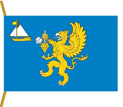 У грифона в руках виноград как раз. Сам грифон - традиционный символ рода Романовых. В левом верхнем углу - “дедушка российского флота”, тот самый ботик, который где-то здесь в каком-то сарае откопал Петр Первый. Его памятник на острове тоже есть.