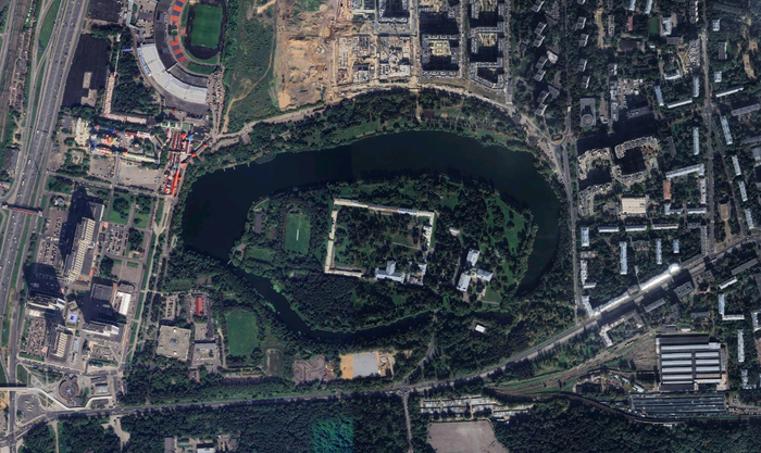 Раньше тут было село, которое еще со времен Ивана Грозного облюбовали различные представители рода Романовых. Но главные события произошли здесь во второй половине 17 века при царе Алексее Михайловиче. В центре заметного белого прямоугольника на снимке выше (это стены сейчас) построили загородную царскую резиденцию. Речку путем нехитрых манипуляций превратили в пруд, который называется с тех самых пор Серебряно-Виноградным. Почему Виноградный? Потому что тут выращивали виноград тогда. Кто не верит, посмотрите на символику района: