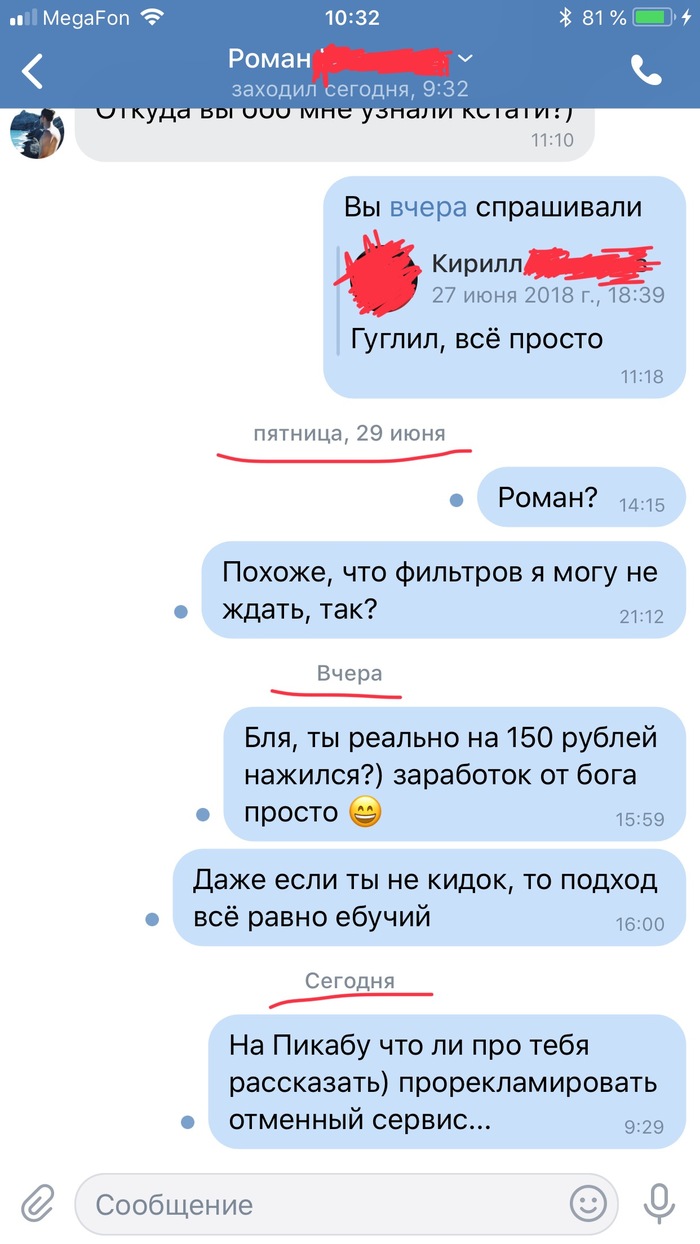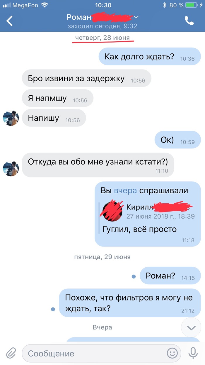 Почему я в таком случае пишу сюда пост - предостеречь тех, кто рискнет полезть в более затратную авантюру и напомнить лишний раз о разводилах. Разводила ли этот Роман или просто недобросовестный (читай, безответственный) коммерс - я не знаю и утверждать не хочу. Мой жизненный принцип прост в этом направлении: Не говори и не обещай ничего, что не собираешься делать, не сей лишнюю надежду в людях. Поэтому если я обещаю что-то сделать - делаю, если обещаю перезвонить людям - перезваниваю. Если не планирую этого делать - сообщаю об этом сразу. Такие дела. Пост из острого чувства несправедливости) Напишите, пожалуйста, что вы думаете об этой ситуации. Я обязательно всем отвечу.