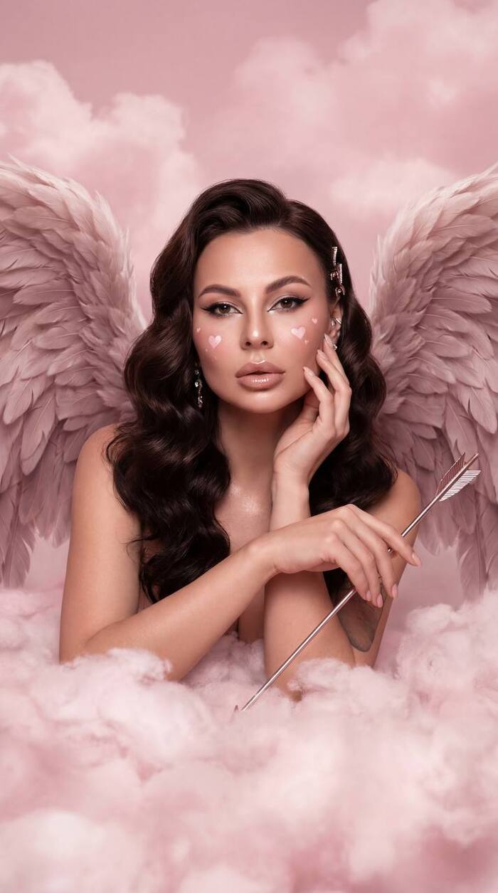 Создай это изображение, используя референсное фото, точно сохраняя черты лица без каких-либо изменений идентичности. Это кампания высокой моды в стиле фантастической красоты в ультрареалистичном исполнении: кинематографический портрет красавицы в образе современной музы Купидона, кадрирование от груди вверх, окружённая мягкими розовыми облаками. Большие пернатые ангельские крылья симметрично простираются за ней, детализированные и утончённые, плавно сливающиеся с фоном. Она слегка наклоняется вперёд, мягко опираясь локтями, руки изящно скрещены, одна рука касается лица в элегантном, контролируемом жесте. Выражение спокойное, уверенное, притягательное, с прямым взглядом и сдержанной соблазнительностью. Волосы уложены в длинные объёмные голливудские волны с высокой плотностью, идеально причесаны, скульптурные, глянцевые, драматично обрамляющие лицо. Макияж эдиториальный гламур с сильным fashion-акцентом: резкая графическая стрелка подводки, мягко растушённые тени, скульптурные брови, сияющая кожа с видимой текстурой, глянцевые чёткие губы и лёгкие акценты в форме сердечек на щеках для поддержки фантазии о Валентине. Аксессуары минимальные и утончённые: изящные серьги, маленькие заколки для волос и лёгкие украшения, усиливающие образ, но не доминирующие. Она нежно держит тонкую металлическую стрелу как символический элегантный реквизит — не мультяшный. Цветовая палитра монохромная и отполированная, построенная на оттенках розового, розового, румянца и мягкого маув. Освещение — мягкий кинематографический студийный свет с нежным свечением, плавными градиентами и контролируемыми бликами — мечтательное, но чёткое и детализированное, без жёстких теней. Общее настроение — роскошная валентинская фантазия: современный Купидон, романтичный, но мощный, эдиториальная уверенность и женственность. Стиль и качество — ультрареалистичная высокодетализированная fashion-фотография с малой глубиной резкости, ретушью уровня журнала, без фильтров, без текста и без водяных знаков.