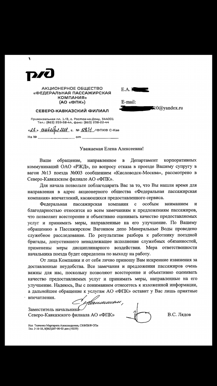 Здравствуйте, всемогущие и всесильные пикабушники! В продолжение своего вчерашнего поста https://pikabu.ru/story/proizvol_na_rzhd_6180734 могу сказать следующее: через пять часов после публикации мне позвонили с незнакомого номера, представившись Кирсановым Александром Михайловичем-начальником пассажирского вагонного депо Минеральных Вод. Александр Михайлович принес извинения от лица компании за непрофессиональное поведение своих сотрудников и предложил урегулировать конфликт путем возмещения стоимости проезда. К его предложению мною была добавлена трата на получение справки-подтверждения в размере 210 рублей и возмещение морального вреда в размере 1000 рублей. Мне согласились возместить всю сумму