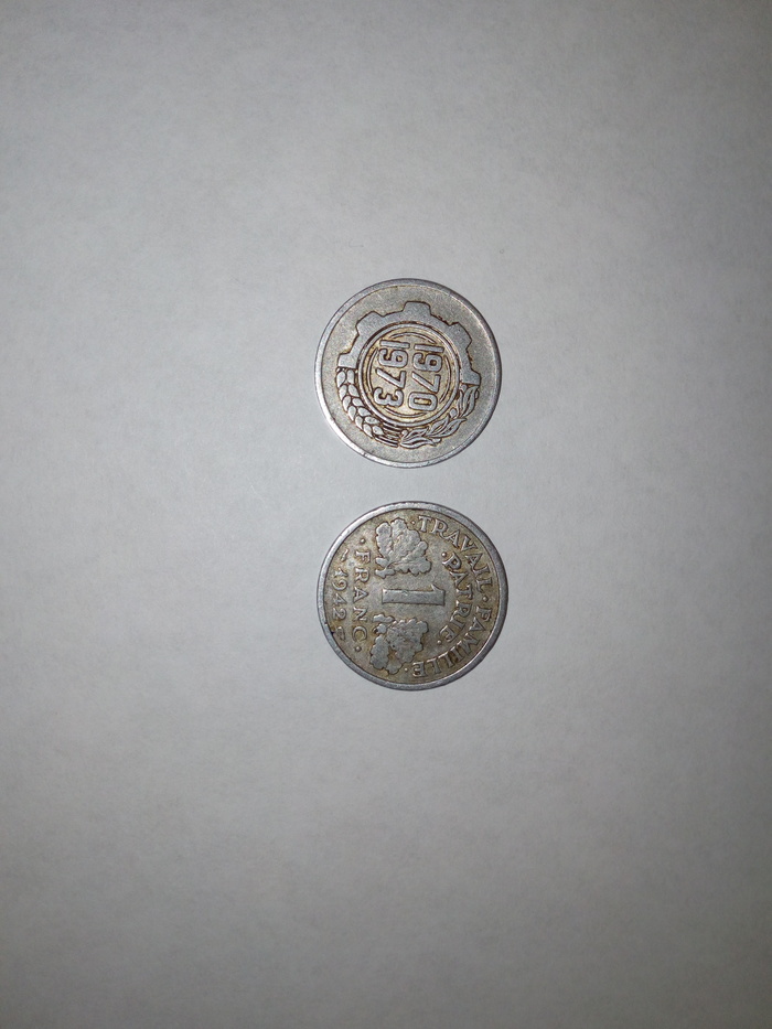 Монета номиналом 1 франк сделана из той же пары металла, имеет массу 4,4 грамма и диаметр 23.2 мм.