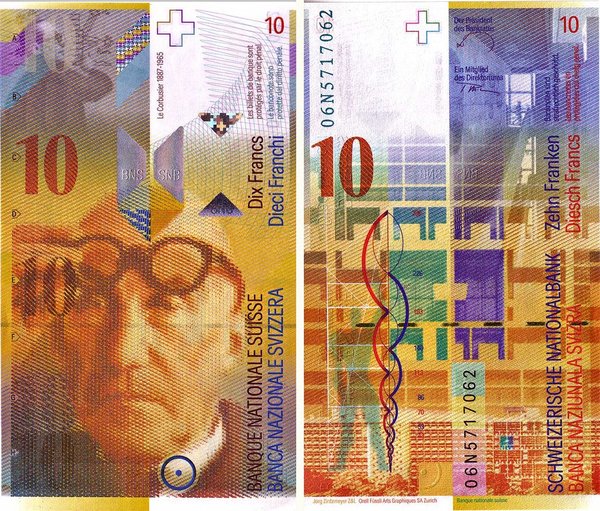 Банкнота номиналом 10 швейцарских франков имеет два цвета – голубой и коричнево-оранжевый. На лицевой части банкноты – Ле Корбюзье (известный архитектор и художник). На оборотной стороне – Дворец Правосудия, расположенный в Чандигархе. Размер купюры – 74*126 мм.
