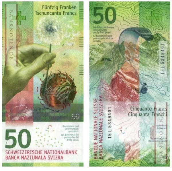 Банкнота номиналом 50 швейцарских франков имеет пурпурный и оливково-зеленые цвета. На лицевой стороне изображена Софи Тойбер-Арп (швейцарская скульптор и художница), на оборотной – представлены некоторые ее работы. Размер купюры – 74*148 мм. Введена в оборот с 3 октября 1995-го года.