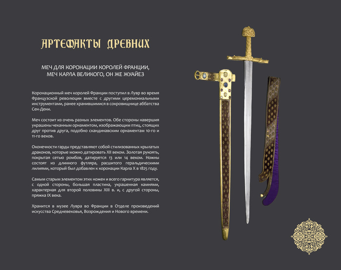 То есть все остальные части меча подверглись изменениям и модификациям, благодаря чему меч выглядит как новый и по сей день. Именно поэтому в музее Лувра почти все части меча указаны как относящиеся к разным векам.