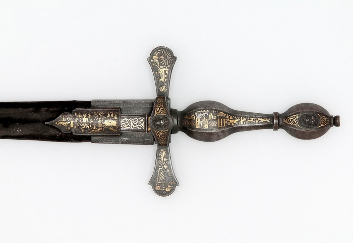 Рапира, около 1600 года, Франция. Клинок испанский. Вороненая сталь, инкрустированная золотом. Victoria and Albert Museum, London.