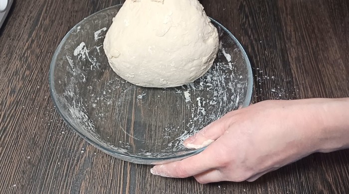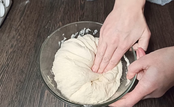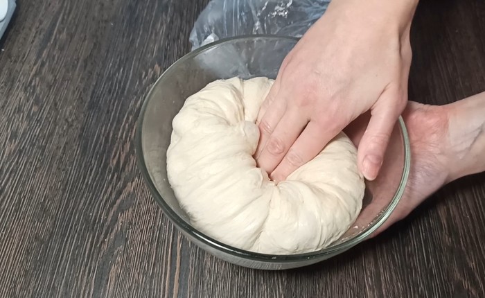 Пальцы припыляю мукой и не доставая тесто из миски, его края заворачиваю к центру и придавливаю, по кругу. Переворачиваю тесто "верх ногами".