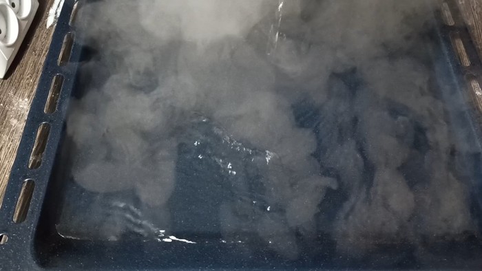 12) На противень выливаю кипяток и ставлю его на нижний уровень в духовке. Багеты ставлю на средний уровень.