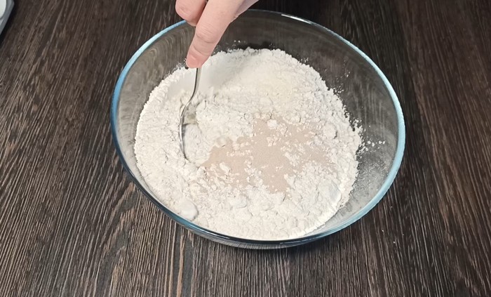 1) Соединяю муку, дрожжи и соль, хорошо перемешиваю.