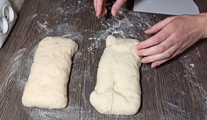 Тесто достаю из миски и его необходимо разделить на 2 части. Каждую часть руками нужно расплющить и завернуть края к центру, сформировав 4-х угольники.