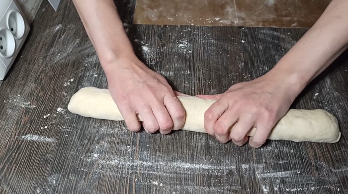 8) Через 10 мин стол и руки припыляю мукой, каждую часть нужно расплющить пальцами и закрутить в рулет. После каждый оборота "рулета" - прищипываю его к стенкам, чтобы не образовались пустоты при выпекании.