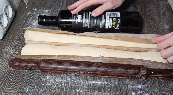 10) Тесту нужно отдохнуть перед выпеканием 40 минут. Чтобы заготовки остались в уже сформировавшей толщине и тесто не "подошло" - нужно по бокам сделать бортик (у меня скалка и бутылка).