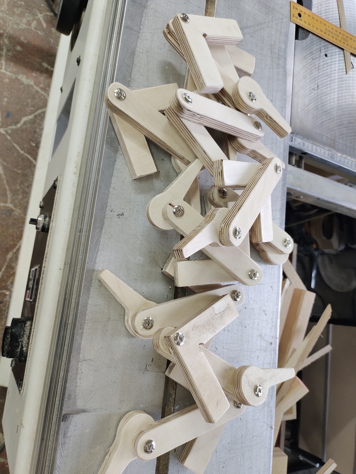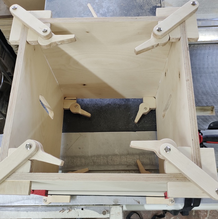 Понадобилось склеить 45 квадратных ящиков 3х размеров из 15той фанеры. Склейка должна быть под 45 градусов и без гвоздей, шпилек. Внутренних уголков. В прошлый раз использовал обычные струбцины, но на такое количество, да собственно как и всегда струбцин не хватает. С обрезков от распила,после непродолжительного проектирования, в интернет не лез, там в основном все похожее и посложнее, было и решено что то попробовать.