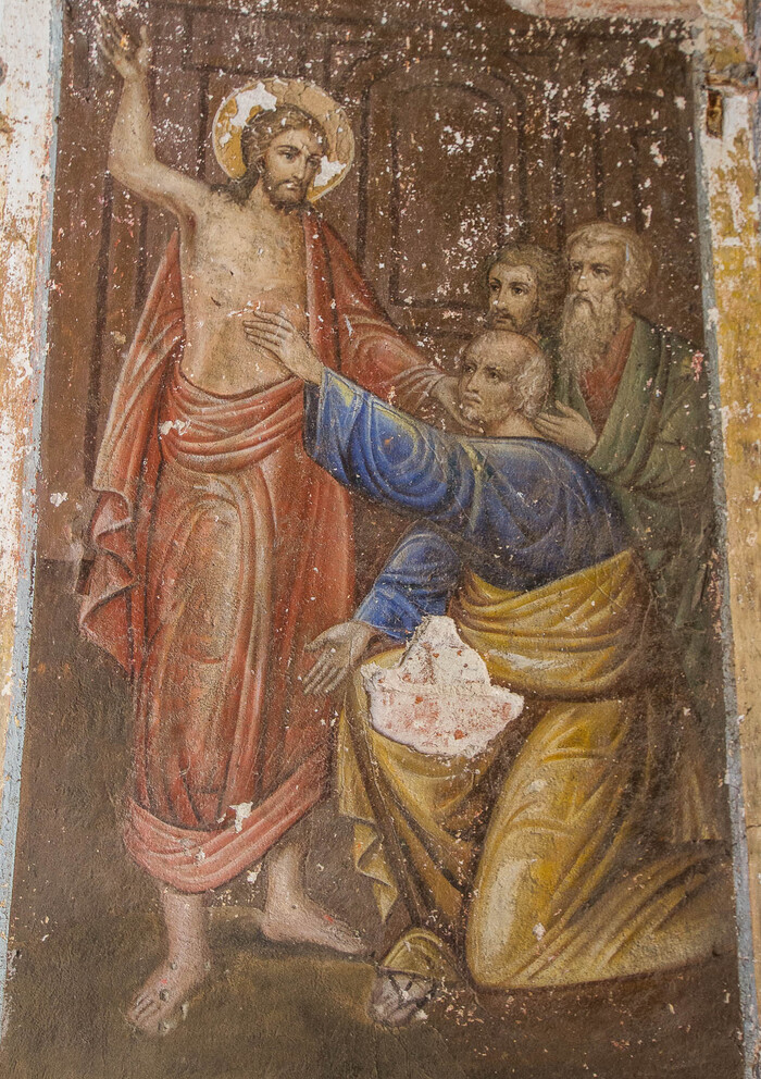 Не могу я закончить экскурсию на такой ноте. Судя по фотографиям фрески на стене, собака смотрит на птичек. И некоторые искусствоведы предполагают, что собака не тонет, а выглядывает из-за склона холма.