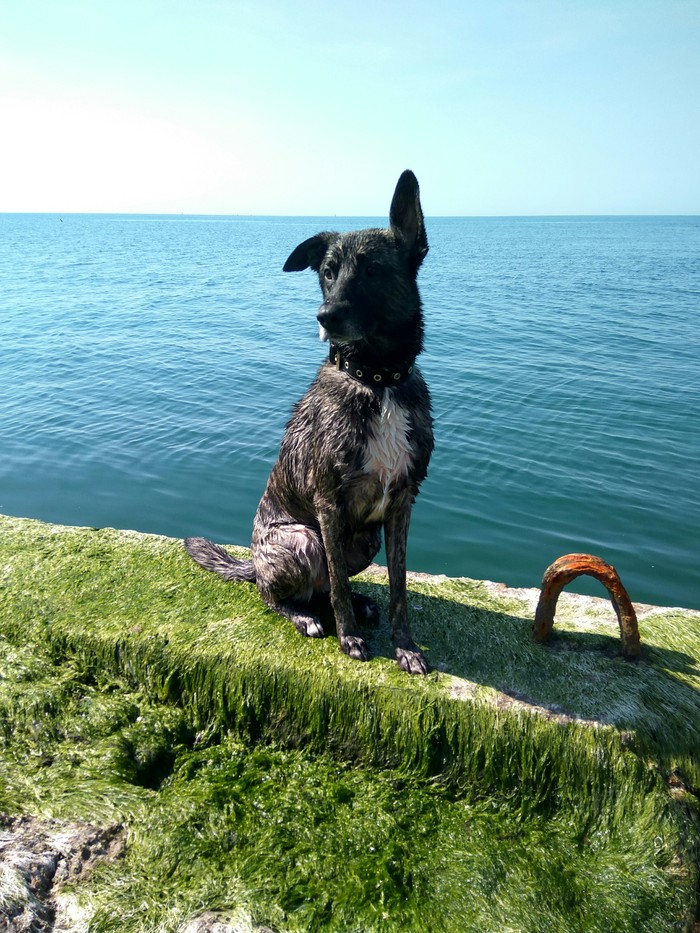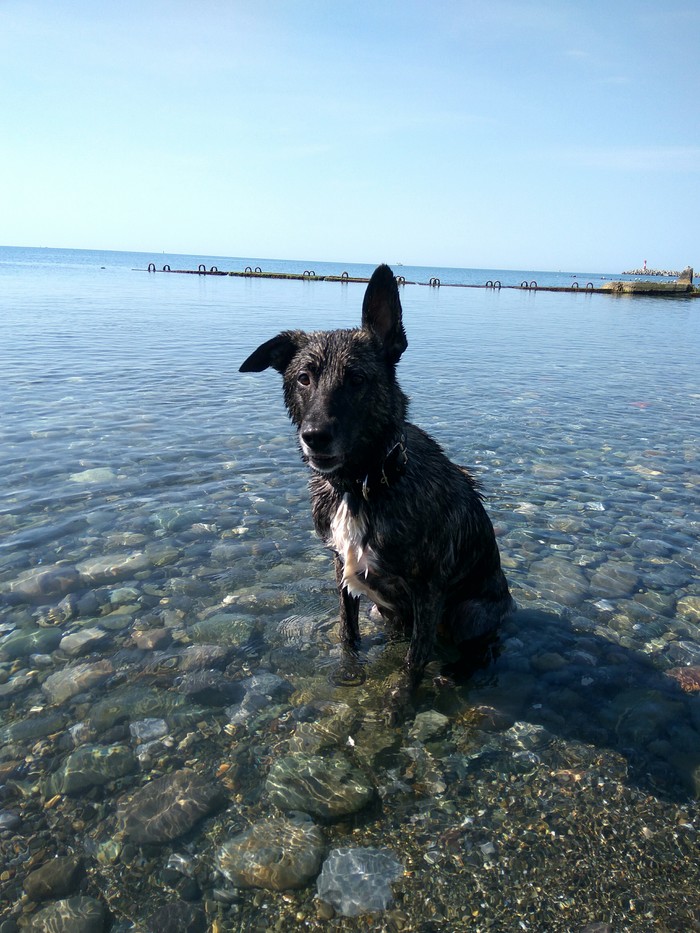 Купание в море - наше всё. Люди на берегу снимают на видео, как Фрея с восторгом, словно торпеда, влетает в воду за палкой/камушком.
