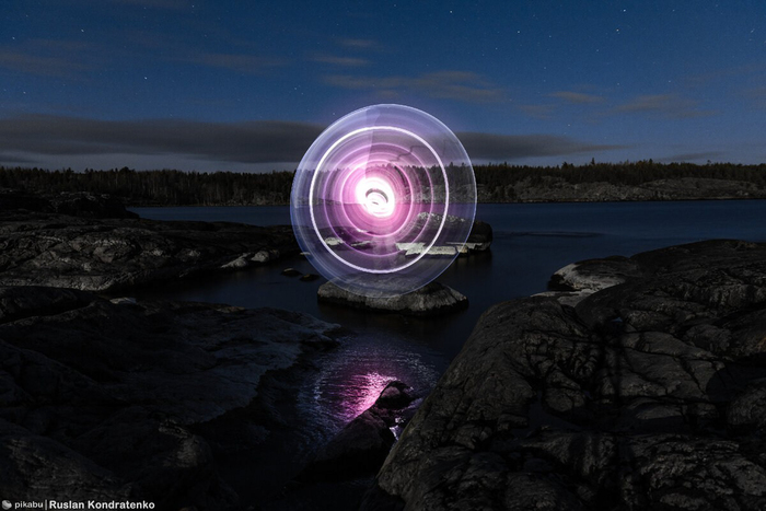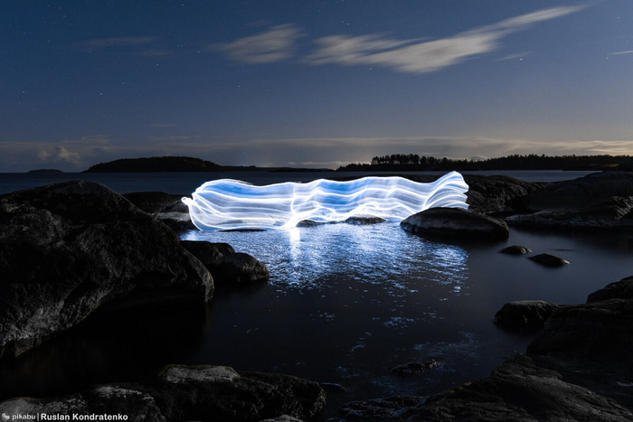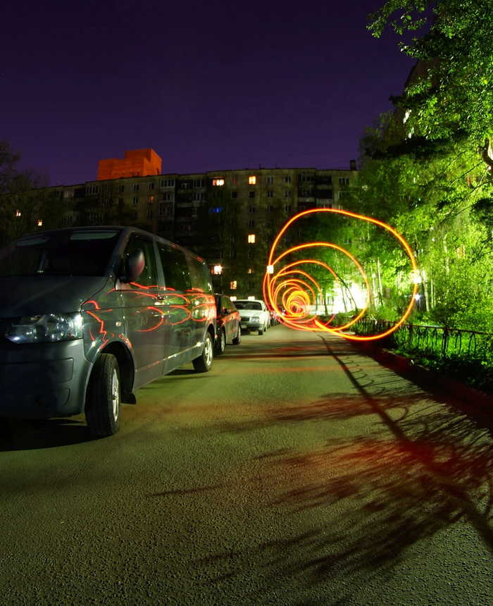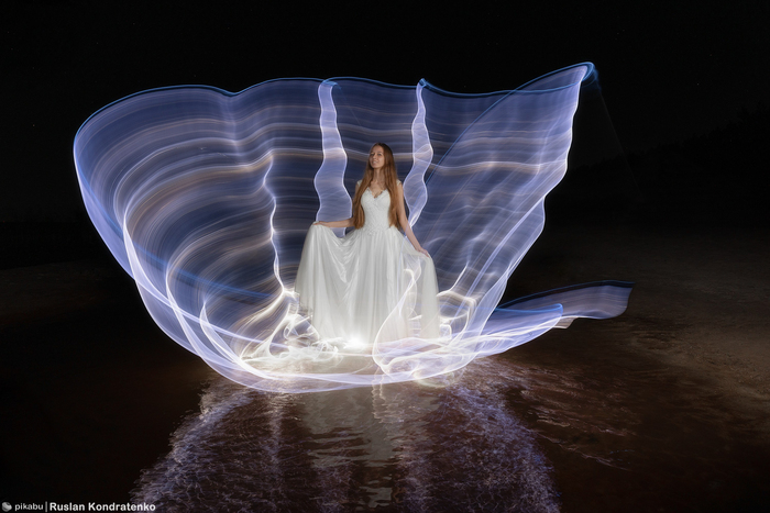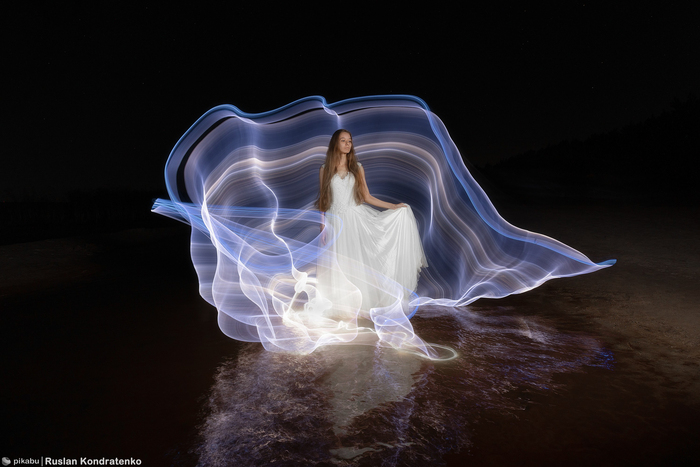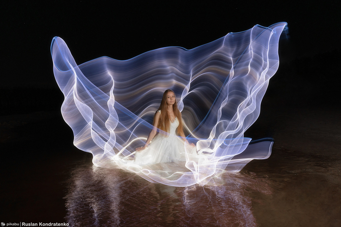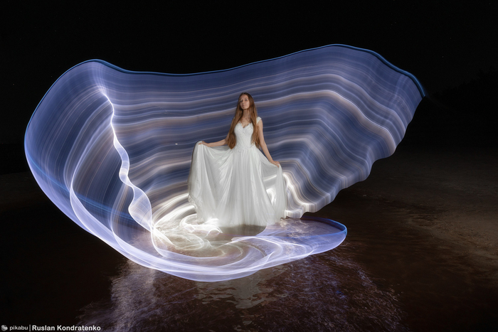 Стоит отметить, что на работу в данном направлении меня вдохновил один из русских фотографов — Сергей Савенко (крайне рекомендую посетить страницу и заценить его работы), который так просто не раскрывает секреты своих техник съемки. Поэтому с некоторыми пришлось разбираться самому, в частности с техникой получения эдакого полотна из света, с большим количеством изгибов, неровностей, завихрений, что, несомненно, очень привлекает своей самобытностью и особенностью.