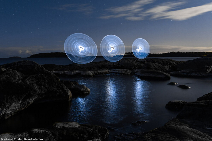 Вспышка. Вся съемка проходила на берегу Ладожского озера (60.047083, 31.097976) глубокой безветренной ночью. А значит модель надо как-то «зафиксировать» в кадре. Вспышка, расположенная на стойке, в сочетании со стрипбоксом с сотами как нельзя лучше справилась с этой задачей. Стрипбокс и соты нужны для того, чтобы свет был направлен преимущественно на модель и как можно меньше на окружающее пространство, которое в кадре Я видеть не хотел. Кстати говоря вспышкой далеко не всегда пользуются при съемке в подобной технике, часто просто вытягивают объекты из теней - тут выбор за вами.