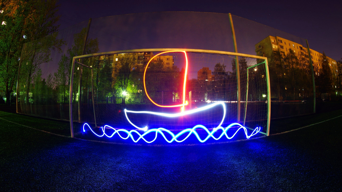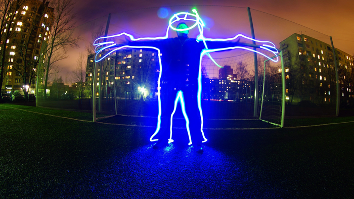 — четвертый момент — во время последнего движения кисти выключите фонарик, не раздумывая киньте световую кист на землю за модель и выйдите из кадра. Зачем это нужно? Всё просто, если вы не будете выключать фонарик после завершения всех движений, то получите в итоге пересвет в виде одной толстой кривой линии в месте завершения танцев с бубном, в смысле с оптоволокном, а также, скорее всего и сами в кадре будете запечатлены.