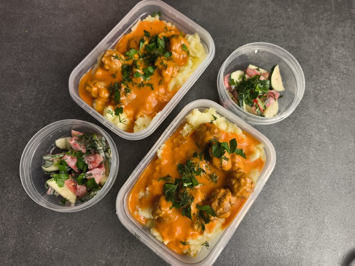 Я раскладываю еду по контейнерам и везу в мотогараж ребятам) работа работой, а обед по расписанию!