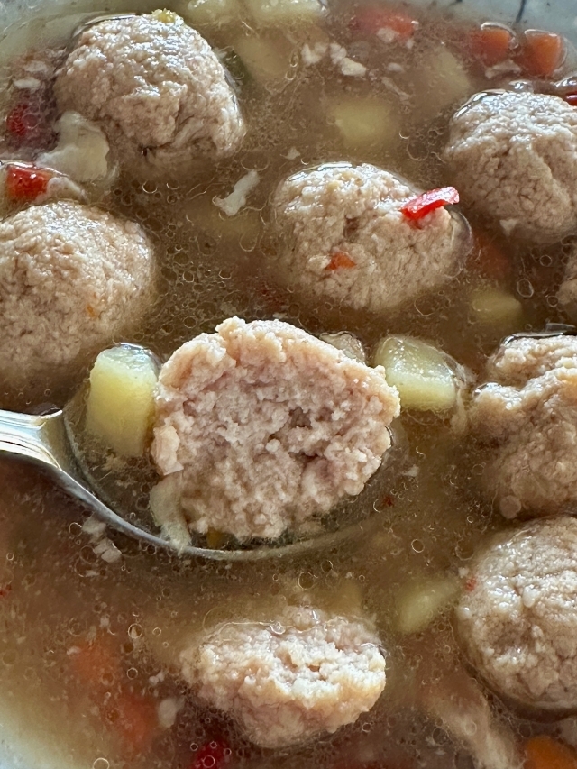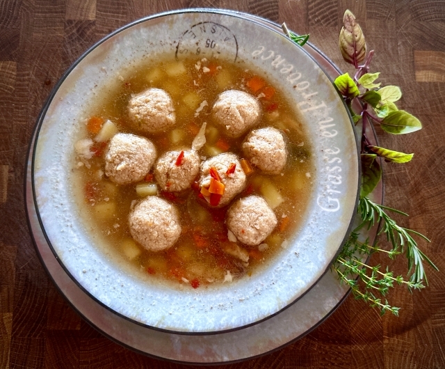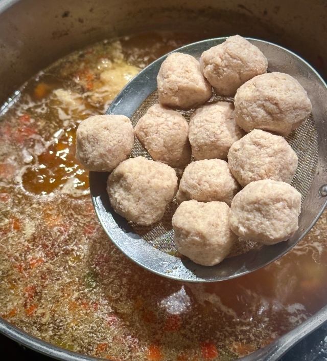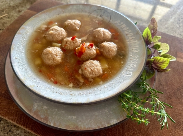 Куриный суп с фрикадельками из рыбы, свинины и креветок