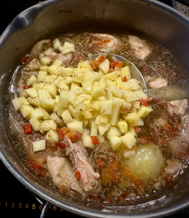 Когда картошка уже почти сварилась убрал все куриные «запчасти, лук и … добавил пол-литра воды. Очень уж насыщенно, потому что получилось.