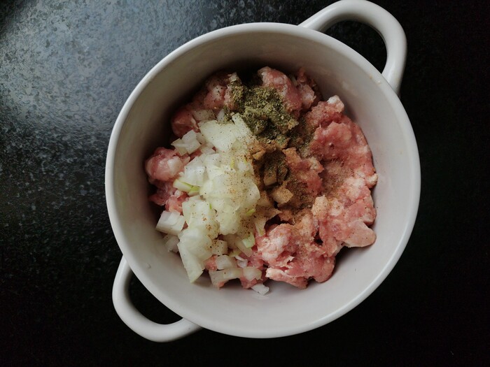 2. Смешиваем фарш с мелко нарезанной луковицей, солью, щепоткой итальянских трав и молотого перца.