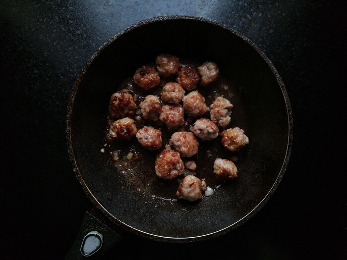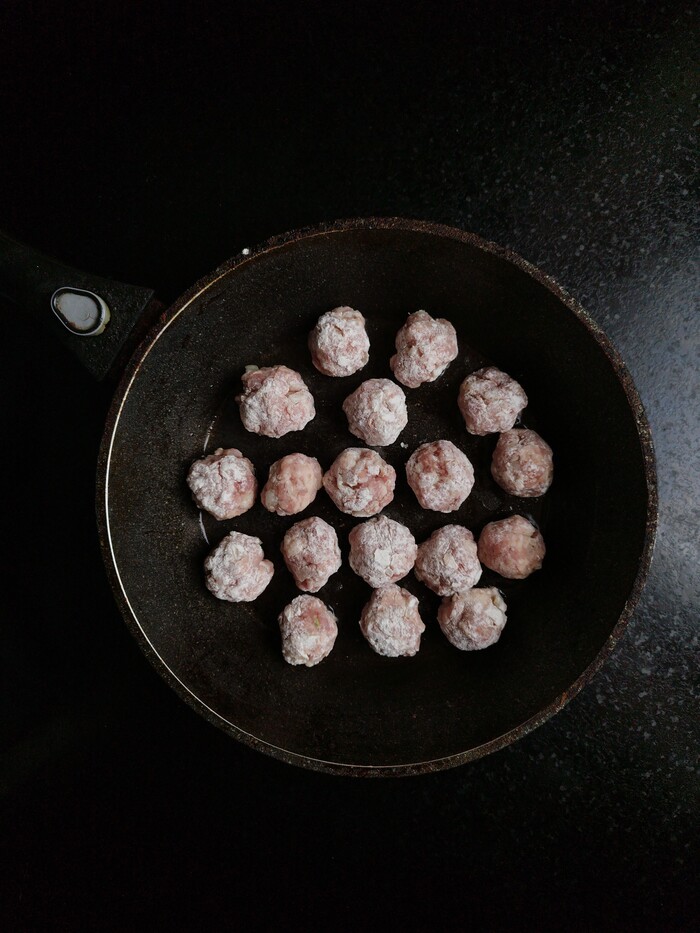 Для начала, подготовьте свинину: выберите качественный кусок мяса, тщательно очистите его от пленок и лишнего жира, после чего дважды пропустите через мясорубку. Этот процесс позволит добиться идеальной текстуры, необходимой для сочных и нежных шариков. Вымешивая фарш, добавьте к нему соль и перец по вкусу, а также холодную воду — это важный шаг, который обеспечит сочность готовых фрикаделек. Вымешивайте фарш до однородности, активно отбивая его об стенки миски для лучшей связности. Затем добавьте пшеничную муку и продолжайте вымешивать до получения однородной массы. Из готового фарша сформируйте небольшие шарики, напоминающие по размеру томаты черри.