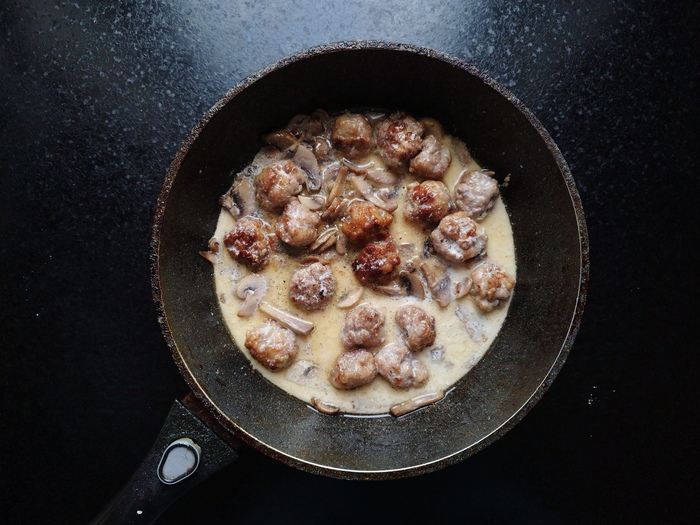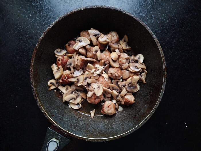 6. Соединяем грибы и фрикадельки, добавляем измельченный зубчик чеснока, соль перец. Прогреваем все вместе пару минут