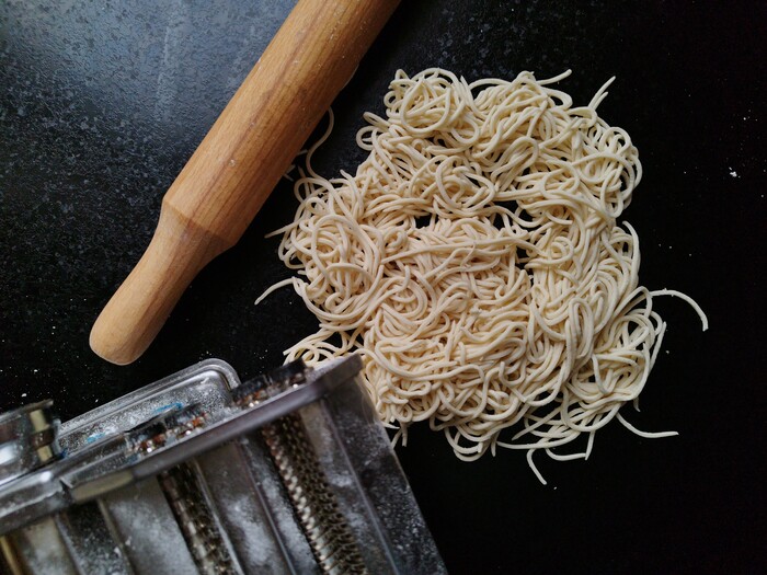 8. Варим воду на спагетти. Пока вода варится тесто тоненько раскатываем и нарещаем. Я воспользовалась специальной машинкой. Вы можете вообще не напрягаться и сварить готовые макарохи.