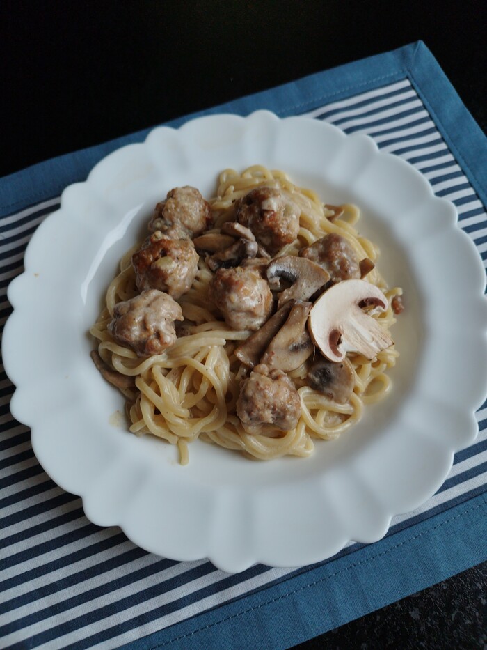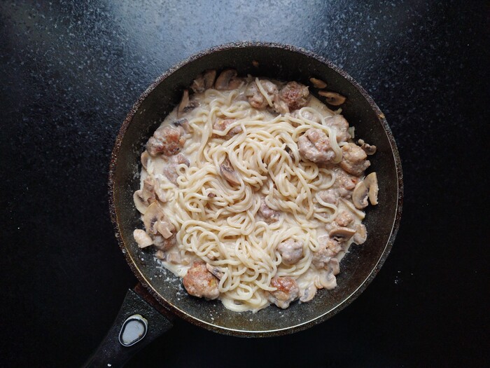 9. Сваренные макарохи отправляем в сковороду к соусу и фрикаделькам, солим перчим, давленый чесночек... Доводим до первых булек и выключаем. Если соус показался сильно жидким - можно сыпануть чуть муки. Но вообще, дайте всему этому постоять пару тройку минут. Соус уменьшится в объеме и загустеет.