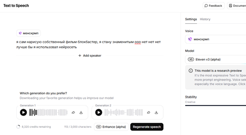 Вставь реплики персонажа, выбери нужный голос и скачай готовую реплику в mp3.