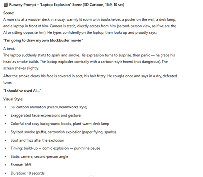«напиши промт для Runway на сценку: мужчина сидит за столом в комнате, перед ноутбуком, печатает что-то и говорит "я нарисую собственный фильм блокбастер", потом ноутбук начинает дымиться, парень хватается за голову, ноутбук взрывается и лицо парня покрывается сажей и парень говорит "лучше бы я использовал нейросеть", вид камеры от второго лица напротив него, формат видео 16:9, время видео 10 секунд»