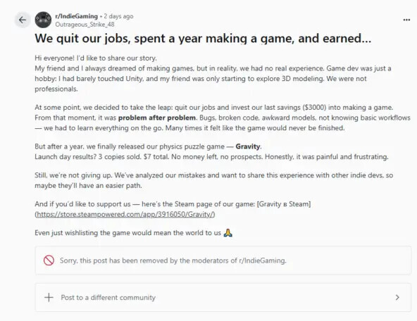 Первым делом я решил поделиться историей на Reddit. Пост вышел в r/IndieGaming и буквально взорвался: за час набралось 20k просмотров, к вечеру — 100k, а на следующий день — 173k. Было море комментариев, советов, критики и фидбека. Это дало большой буст: появились добавления в вишлист и первые продажи.