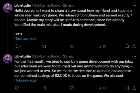 В Twitter есть сильное сообщество инди-разработчиков. Но мне зацепиться за него не удалось: посты не набрали лайков, а конверсии почти не было. Результат: 24 просмотра и 12 переходов в Steam. Здесь очень важно иметь свою аудиторию заранее.