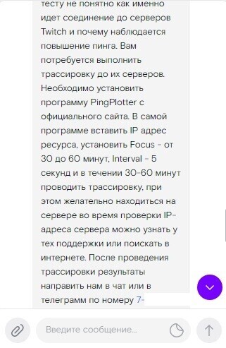 Я написала в чат поддержки своего провайдера Ростелеком. Первые 2 оператора не понимали сути проблемы. Пришлось подробно объяснять термины (стриминг, пропуск кадров, серверы Twitch). Третий подключённый оператор попросил сделать трассировку до проблемных серверов Twitch и прислать результаты. Написал даже инструкцию, как это сделать.